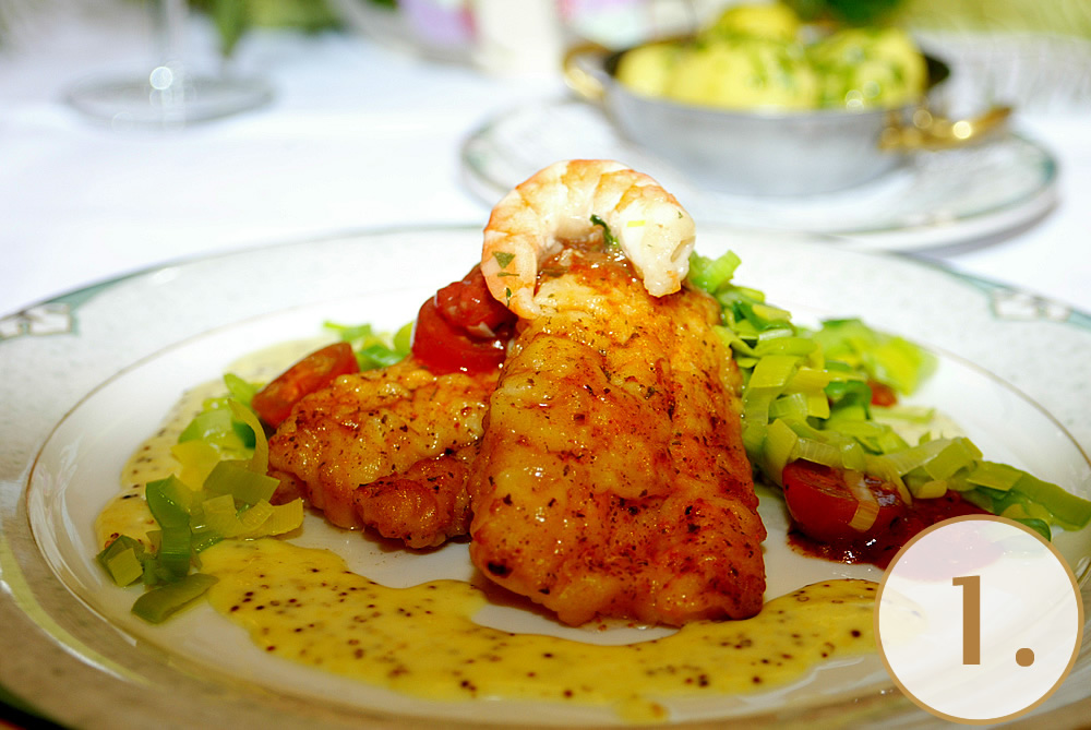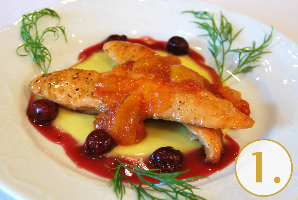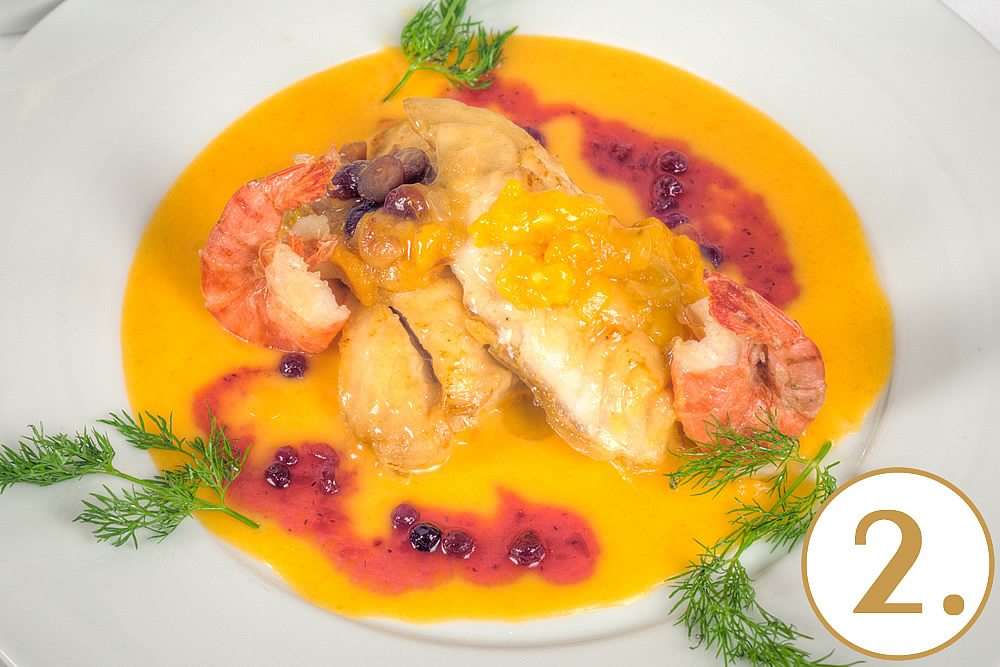 Gebratenes Seelachsfilet auf einer Karottencreme, garniert mit Garnelen-schwänzen und zweierlei Chutney von Aprikose, Apfel und Cranberries dazu ein Salat und Reis