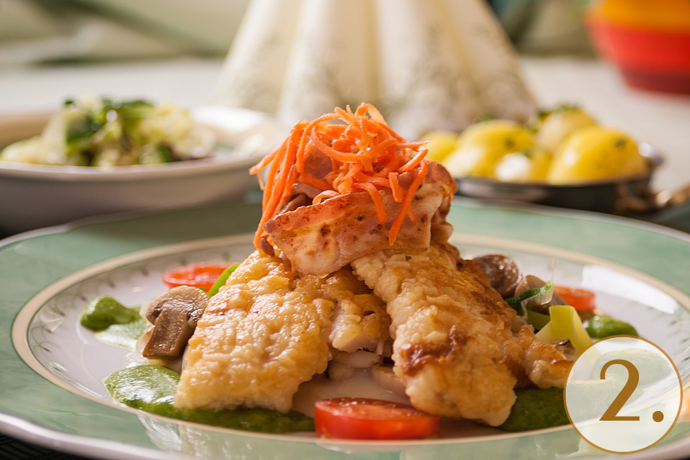 Gebratenes Filet vom blauen Wittling auf Champignons in Rahm, mit Kräuterschaum umzogen, garniert mit Röstspeck und Tomate, dazu Salat und Kartoffeln
