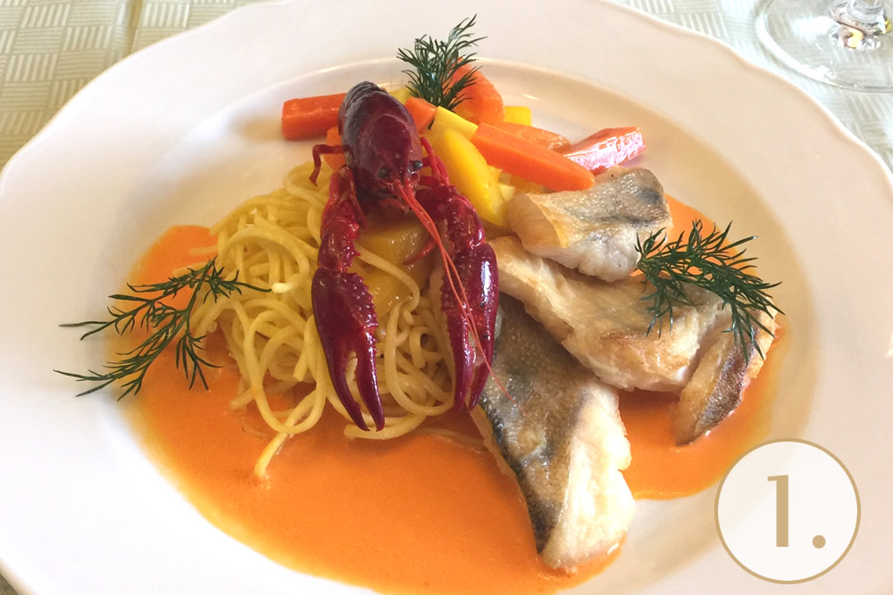 Zart angebratenes Zanderfilet, serviert auf frisch zubereitetem Möhren-Pastinaken-Gemüse an Krebssauce mit feinen Bandnudeln