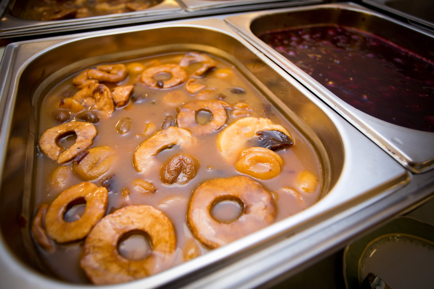 Mehlbeutel mit Kasseler vom Schweinenacken, Kochwurst, Schweinebacke, Honig-Backobstsauce und Kirschsauce